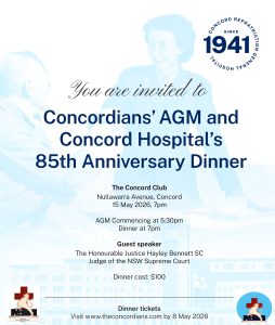 The Concordians is an Association of past and present staff of Concord Repatriation General Hospital. Our mission is to embrace and articulate the origins and history of the hospital, to promote its unique culture of communication and compassion and to nurture and support our members. The Concordians is a Not for Profit Incorporated Association.